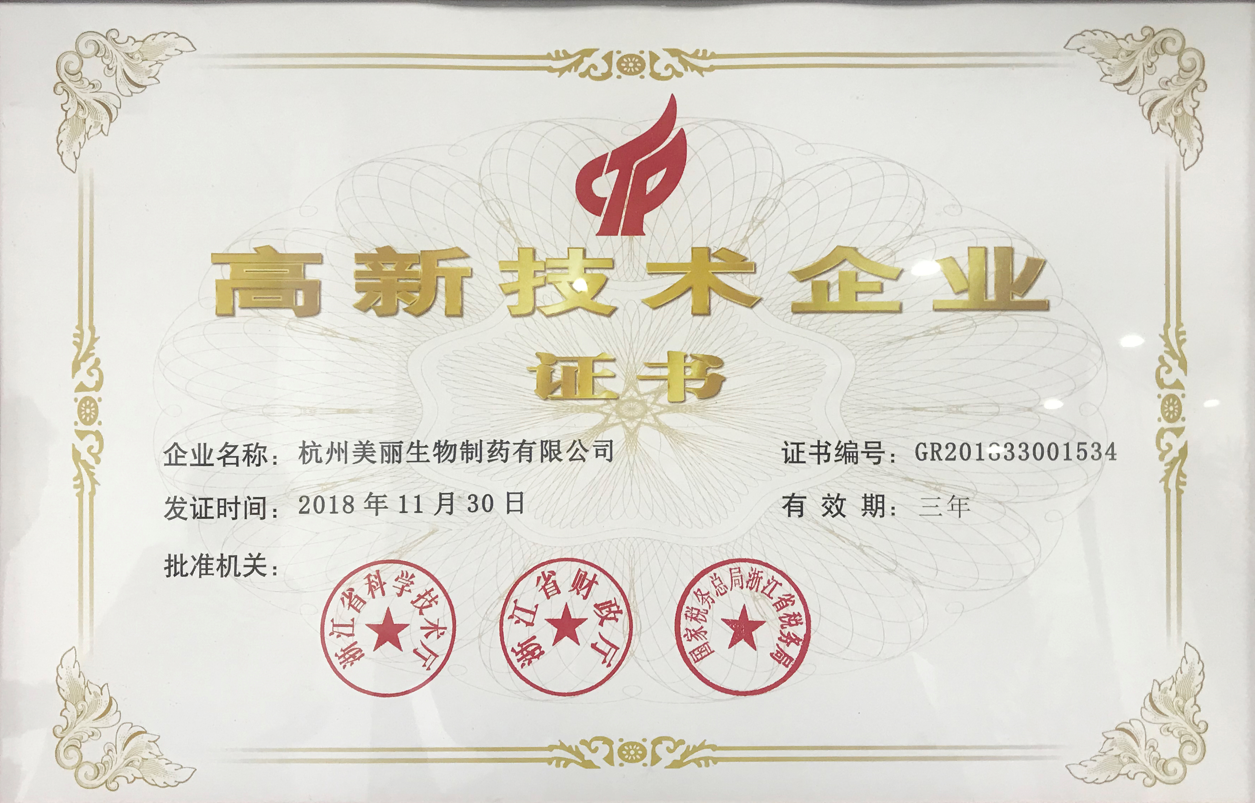 【杭州美依生物科技有限公司&杭州芙源生物制藥有限公司】均榮獲“國家級高新技術(shù)企業(yè)”證書!