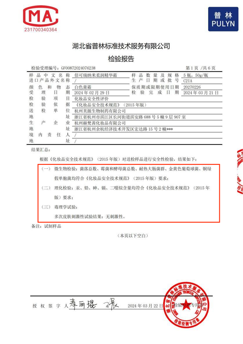 納米柔潤(rùn)精華霜產(chǎn)品檢驗(yàn)報(bào)告